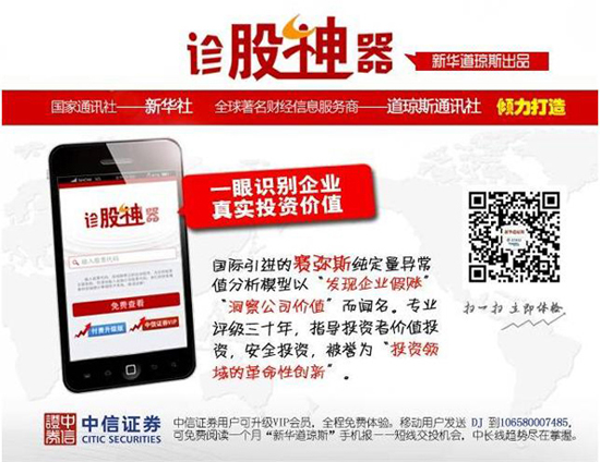 想聽見股市花開的聲音么?掃描圖片中二維碼,即刻關(guān)注“新華道瓊斯”微信服務(wù)號!輸入股票代碼,秒查個股投資財務(wù)安全評級!