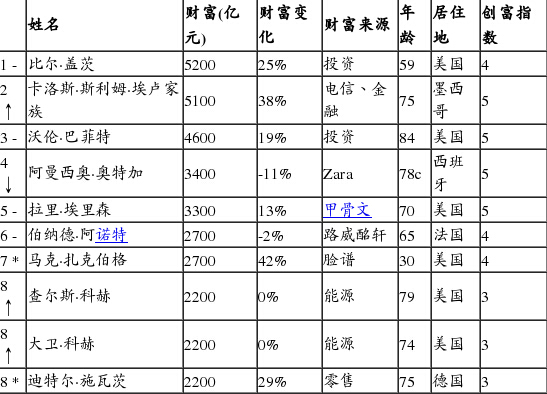 全球十億美金富豪增加222人,達(dá)到2089人,歷年最高。