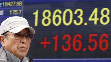 2月24日,一名男子經(jīng)過(guò)日本東京街頭的股指顯示牌。 受日元持續(xù)小幅貶值等積極因素提振,24日東京股市連續(xù)第五個(gè)交易日收高,日經(jīng)225種股票平均價(jià)格指數(shù)在收盤(pán)時(shí)比前一交易日上漲0.74%,再次刷新近15年最高紀(jì)錄。