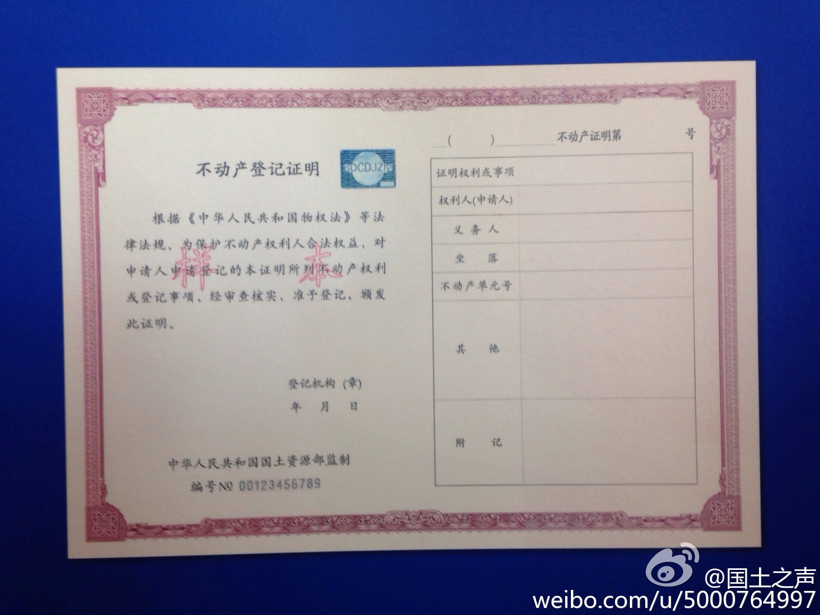據(jù)國(guó)土資源部微博消息,不動(dòng)產(chǎn)登記3月1日正式施行,國(guó)土資源部制定的不動(dòng)產(chǎn)登記簿證樣式也將正式啟用。新的不動(dòng)產(chǎn)登記簿證是什么樣子?今天上午,國(guó)土資源部公布了《不動(dòng)產(chǎn)權(quán)證書》、《不動(dòng)產(chǎn)登記證明》的樣本。