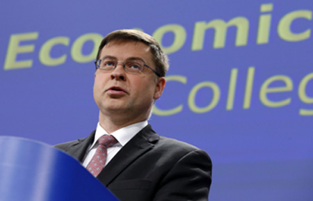 2月25日,在比利時首都布魯塞爾,歐盟委員會副主席、負(fù)責(zé)歐元與社會事務(wù)的委員東布羅夫斯基出席新聞發(fā)布會。 東布羅夫斯基當(dāng)日在新聞發(fā)布會上表示,歐委會決定同意歐元區(qū)第二大經(jīng)濟(jì)體法國推遲兩年至2017年實現(xiàn)歐盟規(guī)定的減赤目標(biāo)。