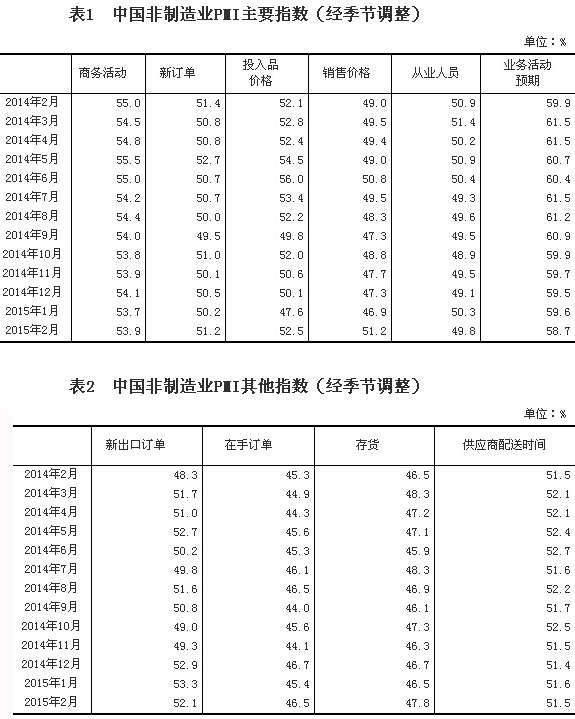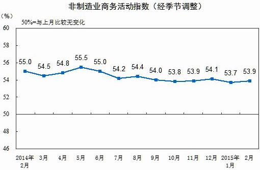 2015年2月,中國非制造業(yè)商務(wù)活動(dòng)指數(shù)為53.9%,比上月上升0.2個(gè)百分點(diǎn),高于榮枯線3.9個(gè)百分點(diǎn),表明我國非制造業(yè)繼續(xù)保持平穩(wěn)擴(kuò)張勢頭。
