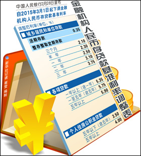距離上次降息3個月之后,央行再次宣布降息:自2015年3月1日起下調金融機構人民幣貸款和存款基準利率。金融機構一年期貸款基準利率下調0.25個百分點至5.35%;一年期存款基準利率下調0.25個百分點至2.5%,同時結合推進利率市場化改革,將金融機構存款利率浮動區(qū)間的上限由存款基準利率的1.2倍調整為1.3倍。