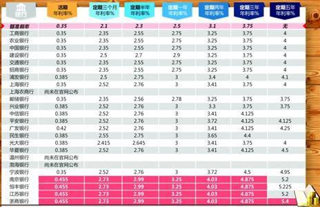 相較工、農(nóng)、中、建、交等幾家大行,一些股份制銀行的存款利率上浮幅度要大得多。降息后不久,浙商銀行、恒豐銀行、南京銀行、江蘇銀行,便率先將所有期限存款利率在央行基準(zhǔn)利率的基礎(chǔ)上,上浮30%,其中,浙商銀行的5年期存款利率更高達(dá)5.4%。而去年11月央行降息后,這幾家銀行也將各檔存款利率,一舉上浮至當(dāng)時(shí)的1.2倍上限。目前上海市場的20余家主流銀行中,只有上海農(nóng)商行、渤海銀行、溫州銀行等少數(shù)幾家銀行尚未更新利率。