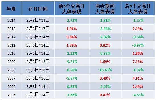 還專門整理了過去10年兩會(huì)期間的大盤表現(xiàn)。