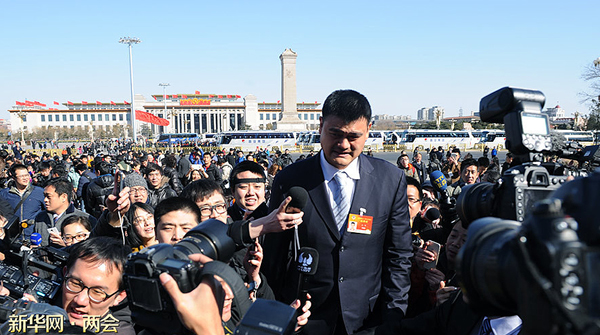 3月3日,中國人民政治協(xié)商會議第十二屆全國委員會第三次會議在北京人民大會堂開幕。這是記者們在人民大會堂東門外廣場拍攝全國政協(xié)委員姚明。 新華網(wǎng) 翟子赫 攝