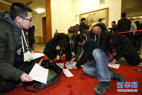 3月5日,第十二屆全國人民代表大會(huì)第三次會(huì)議在北京人民大會(huì)堂開幕。這是記者領(lǐng)到政府工作報(bào)告等文件后就地閱讀。 新華社記者 沈伯韓 攝