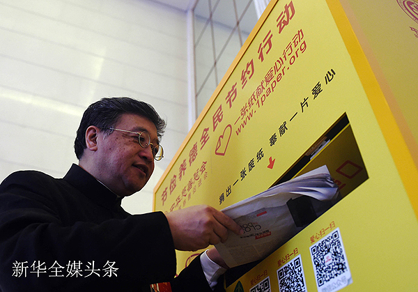 看過的報紙可以拿來獻(xiàn)愛心。這是全國政協(xié)委員何偉將看過的報紙投進(jìn)“愛心屋”。 新華社記者 楊青 攝