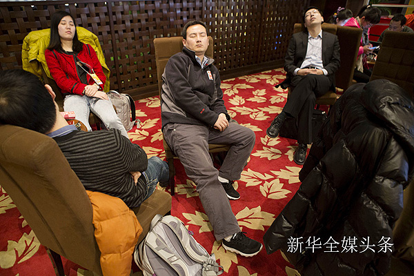 人前風光亮麗,人后辛苦不易!半S時隨地養(yǎng)精蓄銳”是兩會記者必須get的技能。 新華社記者 才揚 攝