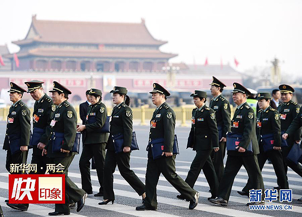 3月12日,十二屆全國人大三次會議在北京人民大會堂舉行第三次全體會議。這是解放軍代表抵達天安門廣場。 新華社記者 陳曄華 攝