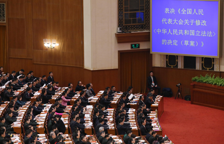 第十二屆全國(guó)人民代表大會(huì)第三次會(huì)議圓滿完成各項(xiàng)議程15日上午在人民大會(huì)堂閉幕。大會(huì)表決通過(guò)關(guān)于修改立法法的決定,國(guó)家主席習(xí)近平簽署第20號(hào)主席令予以公布。 修改后的立法法將“稅收”專門列出,作為只能制定法律的事項(xiàng),明確“稅種的開征、停征和稅收征收管理的基本制度”只能由法律規(guī)定。 圖為代表們?cè)跁?huì)上表決。