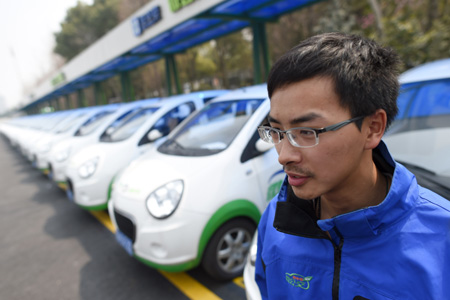 從3月16日起,杭州地鐵1號線江陵路站大型停車場內(nèi)的“微公交”純電動汽車站點正式投入運營。這是目前杭州規(guī)模最大的“微公交”平面租賃站,可提供60輛微型純電動汽車。杭州從2013年9月起試運營“微公交”,目前已有“微公交”純電動汽車9851輛。圖為運營方一名工作人員站在“微公交”江陵路站內(nèi)。