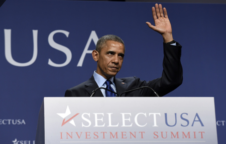 美國總統(tǒng)奧巴馬23日宣布一系列新的行政舉措,吸引外國企業(yè)擴(kuò)大對美直接投資。他表示,美國聯(lián)邦政府將與各州政府加強(qiáng)招商引資合作,為投資者提供在美投資基本知識培訓(xùn)服務(wù)、有關(guān)各州投資激勵(lì)政策的在線數(shù)據(jù)庫和其他投資工具,以幫助投資者確定具體投資對象以及尋找當(dāng)?shù)貪撛诤献骰锇椤D為3月23日奧巴馬在馬里蘭州出席第二屆“選擇美國投資峰會(huì)”。