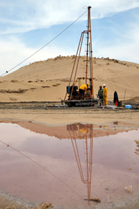 圖為在一處被污染的騰格里沙漠腹地,當?shù)丨h(huán)保人員利用機井抽取不同層面的底泥與地下水樣本,為進一步評估、鑒定提供科學(xué)依據(jù)。