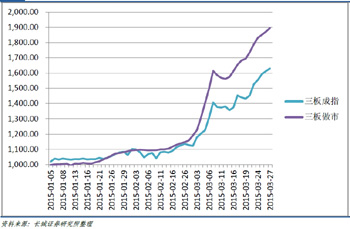 從新三板剛剛發(fā)布的兩個(gè)指數(shù)來看,市場(chǎng)熱度驚人。數(shù)據(jù)顯示,截至3月31日收盤,全國中小企業(yè)股份轉(zhuǎn)讓系統(tǒng)成份指數(shù)(指數(shù)簡(jiǎn)稱:三板成指,指數(shù)代碼:899001)收?qǐng)?bào)1713.32點(diǎn)。全國中小企業(yè)股份轉(zhuǎn)讓系統(tǒng)做市成份指數(shù)(指數(shù)簡(jiǎn)稱:三板做市,指數(shù)代碼:899002)收?qǐng)?bào)1997.64點(diǎn)。2015年以來,三板成指已經(jīng)累計(jì)上漲了71.33%,三板做市已經(jīng)累計(jì)上漲了100.09%,同期,上證綜指和深證成指的漲幅則分別為15.87%和19.48%。
