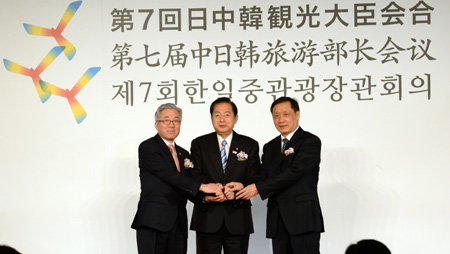 4月11日,在日本東京,中國國家旅游局局長李金早(右)、日本國土交通大臣太田昭宏(中)與韓國文化體育觀光部長官金鐘德合影。 第七屆中日韓旅游部長會議4月11日在東京開始為期兩天的議程。12日,會議發(fā)表聯(lián)合聲明,表示將以開啟中日韓旅游交流新時(shí)代的大幕為契機(jī),作為共同旅游目的地,聯(lián)合推廣“游歷東方”旅游活動,以吸引東亞地區(qū)之外的游客。