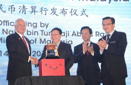 4月14日,在馬來西亞普特拉賈亞,馬來西亞總理納吉布、中國銀行行長陳四清、中國駐馬來西亞大使黃惠康和馬來西亞交通部長廖中萊(從左至右)出席馬來西亞人民幣清算行啟動(dòng)儀式。 當(dāng)日,中國銀行馬來西亞吉隆坡人民幣清算行啟動(dòng)儀式在普特拉賈亞舉行。