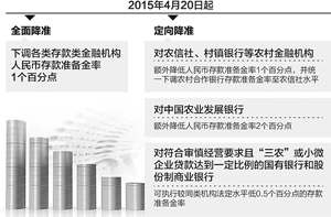 4月19日,央行宣布自20日起下調(diào)各類存款類金融機(jī)構(gòu)人民幣存款準(zhǔn)備金率1個百分點。在此基礎(chǔ)上,為進(jìn)一步增強(qiáng)金融機(jī)構(gòu)支持結(jié)構(gòu)調(diào)整的能力,加大對小微企業(yè)、“三農(nóng)”以及重大水利工程建設(shè)等的支持力度,自4月20日起對農(nóng)信社、村鎮(zhèn)銀行等農(nóng)村金融機(jī)構(gòu)額外降低人民幣存款準(zhǔn)備金率1個百分點,并統(tǒng)一下調(diào)農(nóng)村合作銀行存款準(zhǔn)備金率至農(nóng)信社水平;對中國農(nóng)業(yè)發(fā)展銀行額外降低人民幣存款準(zhǔn)備金率2個百分點;對符合審慎經(jīng)營要求且“三農(nóng)”或小微企業(yè)貸款達(dá)到一定比例的國有銀行和股份制商業(yè)銀行可執(zhí)行較同類機(jī)構(gòu)法定水平低0.5個百分點的存款準(zhǔn)備金率。