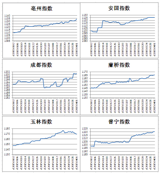2015年第一季度,亳州、安國(guó)、成都、廉橋、玉林、普林6大市場(chǎng)價(jià)格指數(shù)走勢(shì)基本與與整體走勢(shì)一致,尤其是亳州走勢(shì)基本吻合。從下圖各大市場(chǎng)具體走勢(shì)來(lái)看,玉林近期指數(shù)違反常規(guī)走勢(shì)出現(xiàn)下跌情況,其主要原因是玉林中藥材市場(chǎng)主要集中香料這一塊,由于近期香料狀況普遍下跌所致。2015年第一季度6大市場(chǎng)指數(shù)走勢(shì)如圖2所示。