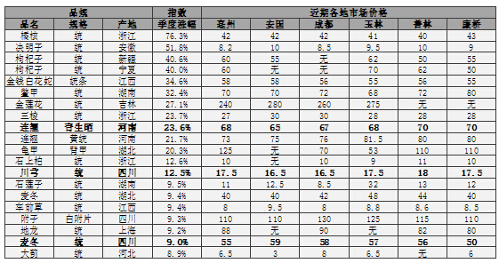 2015年第一季度價(jià)格指數(shù)漲幅最大是品種是橘核,規(guī)格統(tǒng)產(chǎn)地為浙江,指數(shù)漲幅達(dá)到76.3%,橘核價(jià)格大幅上漲主要受到供給影響,原因是目前產(chǎn)地缺貨,但是產(chǎn)新還有相當(dāng)長(zhǎng)一段時(shí)間,而且市場(chǎng)需求一直尚可,從而導(dǎo)致近期價(jià)格的持續(xù)上漲,預(yù)計(jì)短期內(nèi)行情可能會(huì)持續(xù)小幅上升,近期6大中藥材市場(chǎng)橘核價(jià)格基本在40元以上。另外近期值得關(guān)注連翹規(guī)格青生曬產(chǎn)地河南的價(jià)格指數(shù)上漲23.6%,川芎統(tǒng)四川上漲12.5%,麥冬統(tǒng)四川指數(shù)上漲9%。一季度價(jià)格指數(shù)漲幅排名前二十具體品規(guī)以及各市場(chǎng)參考價(jià)格如表1所示。