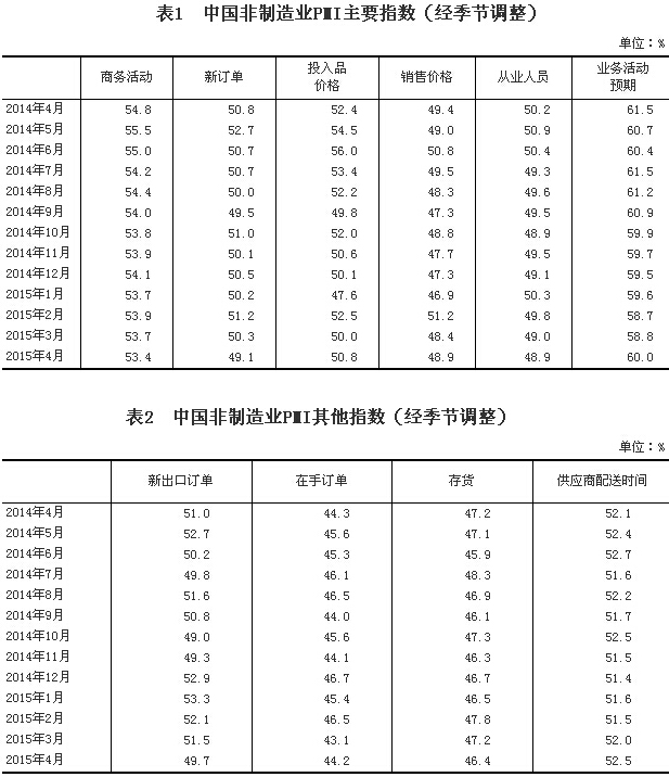 2015年4月,中國非制造業(yè)商務(wù)活動指數(shù)為53.4%,比上月小幅回落0.3個百分點,高于榮枯線3.4個百分點,表明我國非制造業(yè)繼續(xù)保持擴張狀態(tài),但增速略有放緩。