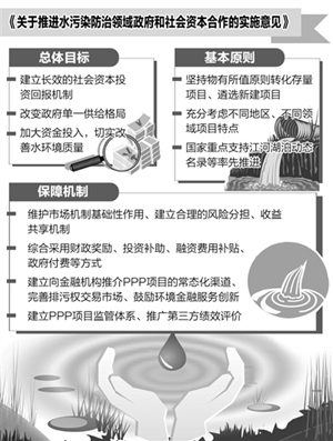 財政部和環(huán)保部日前聯(lián)合發(fā)布《關(guān)于推進水污染防治領(lǐng)域政府和社會資本合作的實施意見》(以下簡稱《意見》),對于下一步水污染防治領(lǐng)域政府和社會資本合作(PPP)項目操作流程作出明確規(guī)范。記者從相關(guān)部門獲悉,從目前情況來看,下一步國家將細化社會資本投資環(huán)保治理領(lǐng)域的鼓勵措施,包括財政、稅收、貸款優(yōu)惠等內(nèi)容。與此同時,環(huán)保部將完善水污染防治領(lǐng)域特許經(jīng)營管理制度,降低準入門檻,清理審批限制,拓寬社會資本投入渠道。