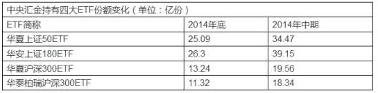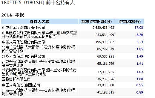華安上證180ETF2014年年報顯示,截至去年底,中央?yún)R金有限責任公司共持有上證180ETF高達26.3億份,占該ETF總份額的57.08%,為其最大單一持有人。