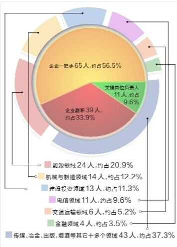 董事長(zhǎng)、總經(jīng)理等一把手毫無(wú)意外地成為國(guó)企腐敗分子中的“大多數(shù)”。115名“落馬”國(guó)企高管中,董事長(zhǎng)、總經(jīng)理等企業(yè)一把手共有65人,如廣東電網(wǎng)公司原總經(jīng)理吳周春、上海市電力公司原總經(jīng)理馮軍[微博]等,占比約56.5%。