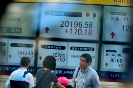 5月20日,在經(jīng)濟(jì)數(shù)據(jù)利好、日元對(duì)美元匯率下跌等多重利好因素提振下,日本東京股市高開(kāi)高走,日經(jīng)225種股票平均價(jià)格指數(shù)實(shí)現(xiàn)4連陽(yáng),創(chuàng)2000年4月以來(lái)最高收盤(pán)點(diǎn)位。至收盤(pán)時(shí),日經(jīng)股指上漲170.18點(diǎn),收于20196.56點(diǎn),漲幅為0.85%。圖為行人站在東京證券交易所外的電子股指顯示屏前。