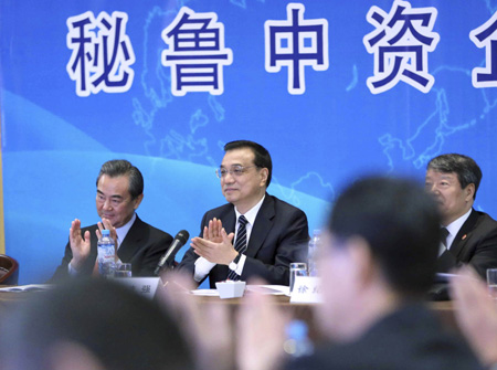 當(dāng)?shù)貢r(shí)間5月23日上午,國(guó)務(wù)院總理李克強(qiáng)在利馬主持秘魯中資企業(yè)座談會(huì)。李克強(qiáng)對(duì)在秘中資企業(yè)提出三點(diǎn)希望:一是以產(chǎn)能合作推動(dòng)中秘合作轉(zhuǎn)型升級(jí)。二是履行好企業(yè)社會(huì)責(zé)任。三是加強(qiáng)協(xié)調(diào)配合,抱團(tuán)出海。
