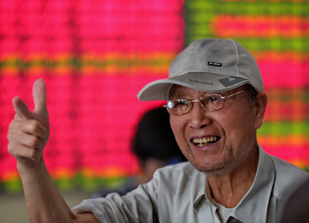 5月25日,滬深股市繼續(xù)強勢走高。上證綜指連過兩關(guān)站上4800點整數(shù)位,創(chuàng)下近七年半新高,報收于4813.80點,較前一交易日大漲156.20點,漲幅高達3.35%。深證成指收報16351.06點,漲305.26點,漲幅達1.90%。與此同時,兩市成交突破2萬億元,改寫“世界紀(jì)錄”。 圖為當(dāng)日在江蘇南通一證券營業(yè)廳內(nèi),一名股民笑容滿面。