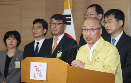 5月31日,在韓國首爾,韓國保健福祉部長官文亨杓(前)在記者會(huì)上發(fā)言。 韓國保健福祉部長官文亨杓31日召開記者會(huì),就韓政府部門對(duì)中東呼吸綜合征的傳染性估計(jì)不足、沒有妥善監(jiān)控與首位韓國患者密切接觸者表示道歉,并表示政府將全力以赴防止新發(fā)病例感染他人。