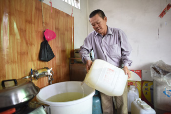 在潮陽區(qū)貴嶼鎮(zhèn)軍寮村,村民陳鎮(zhèn)人告訴記者,自今年清明節(jié)以來,他家里就沒有通過自來水,F(xiàn)在家里的飲用水都得去外面花高價錢購買,每噸水60塊錢,而在平時通自來水時,水價也不過4塊錢一噸,價格是平時的15倍之多。他說:“沒水喝還能怎么辦?再貴也得買!有時候下雨天還得出去買水,很辛苦!