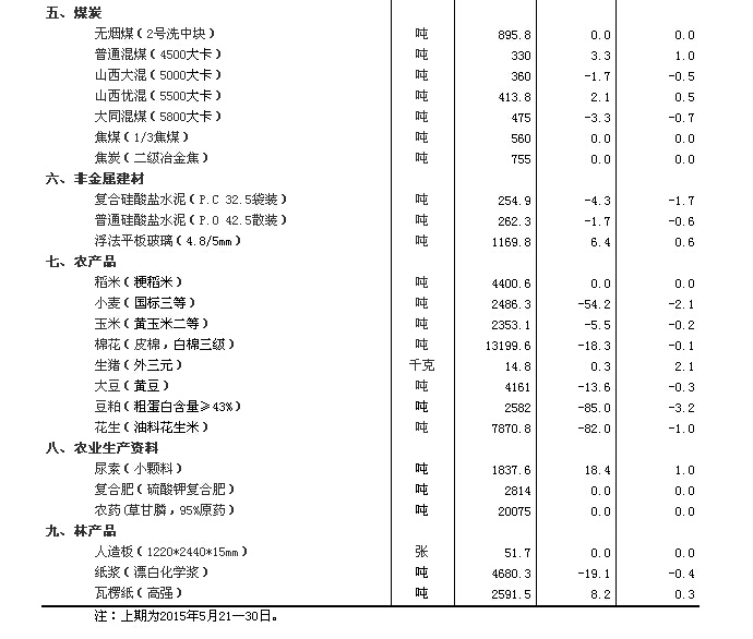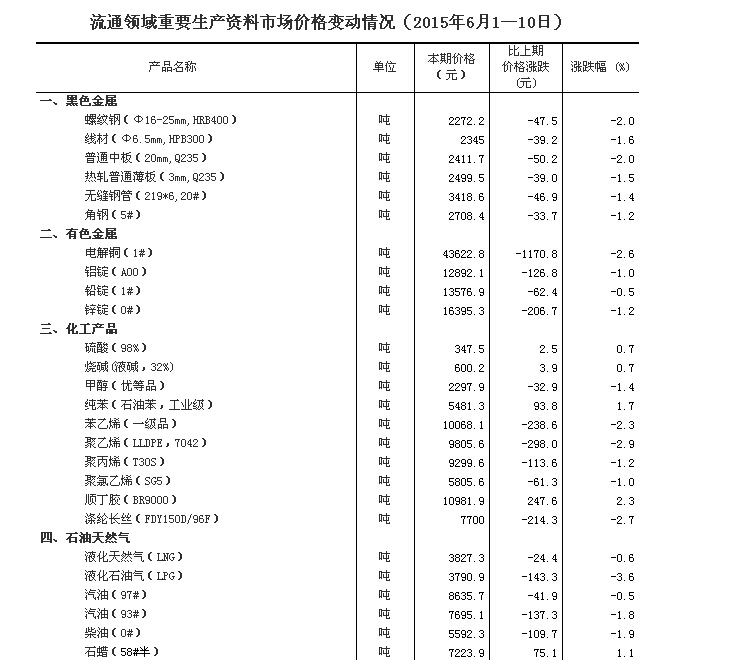 2015年6月上旬,據(jù)對(duì)24個(gè)。▍^(qū)、市)流通領(lǐng)域9大類50種重要生產(chǎn)資料市場(chǎng)價(jià)格的監(jiān)測(cè)顯示,與5月下旬相比,11種產(chǎn)品價(jià)格上漲,32種下降,7種持平。