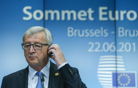 歐元區(qū)領(lǐng)導(dǎo)人緊急峰會(huì)6月22日晚結(jié)束,歐洲理事會(huì)主席圖斯克在會(huì)后新聞發(fā)布會(huì)上說,希臘提交的新版改革方案是“積極的一步”,歐元集團(tuán)24日完成對(duì)新方案的評(píng)估。 圖為歐盟委員會(huì)主席容克出席新聞發(fā)布會(huì),他表示,希臘政府向國際債權(quán)人期望的方向走出重要一步,“我堅(jiān)信本周將完成這個(gè)(債務(wù)談判)進(jìn)程”。