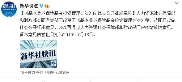 據(jù)新華視點(diǎn)微博消息,人力資源社會保障部和財(cái)政部會同有關(guān)部門起草了《基本養(yǎng)老保險(xiǎn)基金投資管理辦法》稿,從即日起向社會公開征求意見。公眾可通過人力資源社會保障部和財(cái)政部門戶網(wǎng)站反饋意見。征求意見的截止日期為2015年7月13日。
