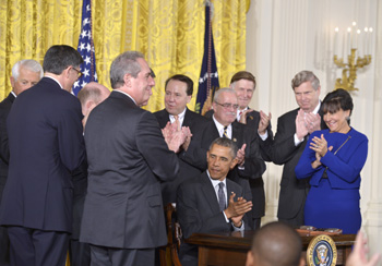 6月29日,在美國(guó)首都華盛頓白宮,美國(guó)總統(tǒng)奧巴馬在簽署法案后鼓掌。 新華社記者