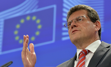 7月1日,在比利時布魯塞爾,歐盟委員會副主席馬羅什·謝夫喬維奇召開關于烏克蘭、俄羅斯和歐盟三方天然氣問題談判的新聞發(fā)布會。 烏克蘭石油天然氣公司當天發(fā)表聲明說,即日起暫停向俄羅斯天然氣工業(yè)股份公司購買天然氣。聲明強調,俄羅斯向歐盟出口的天然氣將繼續(xù)過境烏克蘭進行輸送。