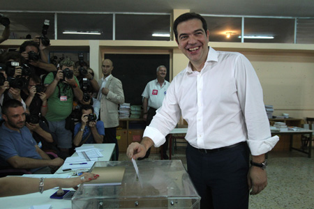 7月5日,在希臘雅典,希臘總理齊普拉斯在一家投票站投票。 希臘5日舉行全民公決,以決定是否接受債權(quán)人早先提出的協(xié)議草案,這將對(duì)如何解決希臘債務(wù)危機(jī)乃至希臘的歐元區(qū)地位產(chǎn)生重要影響。公決初步結(jié)果擬于當(dāng)晚宣布。