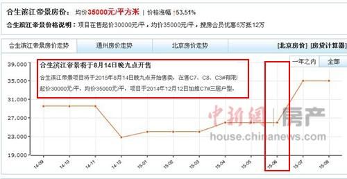 通州合生濱江帝景房價走勢圖:8月14日售價調(diào)整為均價35000元每平米,6月份的均價為26000元每平米。
