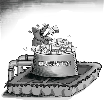 除了惠農(nóng)示范工程,近年來國家還推出了糧食補貼、農(nóng)機補貼、病害豬無害化處理專項資金、扶貧培訓(xùn)專項資金、電影下鄉(xiāng)專項資金等專項補貼或資金。原本為保障和改善民生的惠民政策,在執(zhí)行過程中,卻被一些腐敗分子鉆了空子,惠民資金和補貼被虛報冒領(lǐng)、侵吞挪用的現(xiàn)象屢見不鮮。