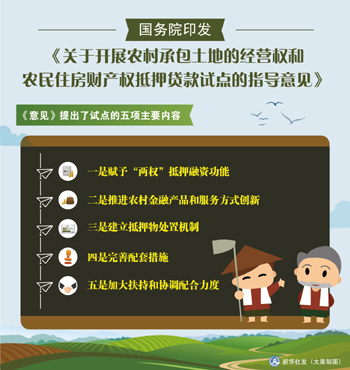 ??? 農(nóng)村金融制度和農(nóng)村土地產(chǎn)權制度的一項重要改革創(chuàng)新——農(nóng)民承包土地的經(jīng)營權和農(nóng)民住房的財產(chǎn)權等“兩權”作為抵押物向金融機構貸款終于迎來了頂層設計。國務院日前正式發(fā)布了《國務院關于開展農(nóng)村承包土地的經(jīng)營權和農(nóng)民住房財產(chǎn)權抵押貸款試點的指導意見》(以下簡稱《意見》),要求試點地區(qū)穩(wěn)妥有序開展“兩權”抵押貸款業(yè)務,有效盤活農(nóng)村資源、資金、資產(chǎn),增加農(nóng)業(yè)生產(chǎn)中長期和規(guī)?;?jīng)營的資金投入,為穩(wěn)步推進農(nóng)村土地制度改革提供經(jīng)驗。