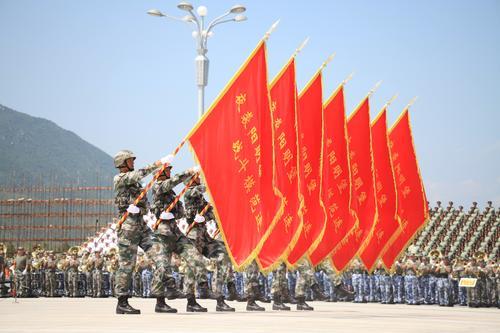 為鮮明地表達(dá)紀(jì)念抗戰(zhàn)勝利這個主題,閱兵領(lǐng)導(dǎo)小組和聯(lián)合指揮部研究決定,由受閱部隊擎舉抗戰(zhàn)部隊番號旗和榮譽(yù)旗在天安門前接受檢閱。盧少澤介紹,70面旗幟,寓意紀(jì)念中國人民抗日戰(zhàn)爭暨世界反法西斯戰(zhàn)爭勝利70周年。其中,10面為抗戰(zhàn)部隊番號旗,60面為抗戰(zhàn)部隊榮譽(yù)旗;每個英模部隊方隊前,1面為番號旗,6面為榮譽(yù)旗。