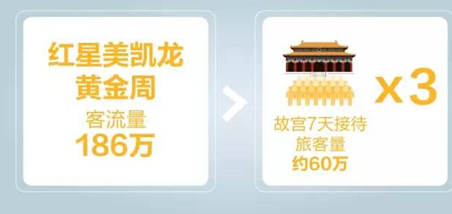 而令人驚訝的是,紅星美凱龍黃金周客流量186萬人次,是故宮的3倍!