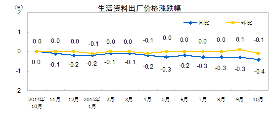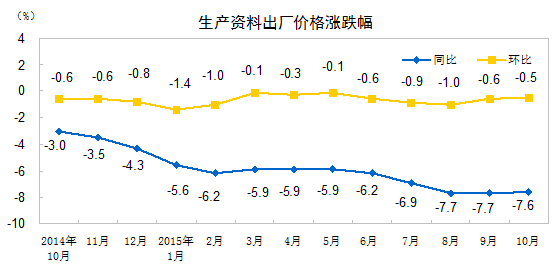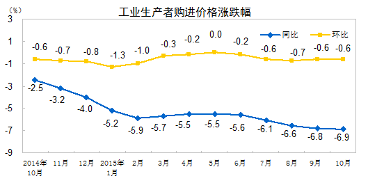 2015年10月份,全國工業(yè)生產(chǎn)者出廠價格環(huán)比下降0.4%,同比下降5.9%。工業(yè)生產(chǎn)者購進(jìn)價格環(huán)比下降0.6%,同比下降6.9%。1-10月平均,工業(yè)生產(chǎn)者出廠價格同比下降5.1%,工業(yè)生產(chǎn)者購進(jìn)價格同比下降6.0%。