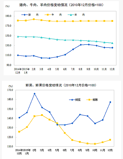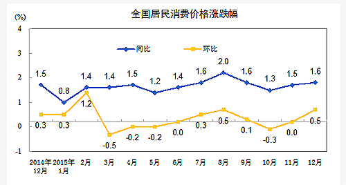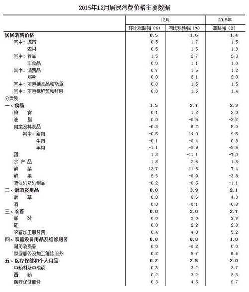 2015年12月份,全國居民消費價格總水平同比上漲1.6%。其中,城市上漲1.7%,農村上漲1.5%;食品價格上漲2.7%,非食品價格上漲1.1%;消費品價格上漲1.5%,服務價格上漲2.1%。2015年,全國居民消費價格總水平比上年上漲1.4%。