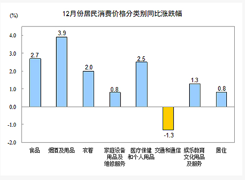 12月份,非食品價格同比上漲1.1%。其中,煙酒及用品、醫(yī)療保健和個人用品、衣著、娛樂教育文化用品及服務、家庭設備用品及維修服務、居住價格分別上漲3.9%、2.5%、2.0%、1.3%、0.8%和0.8%;交通和通信價格下降1.3%。