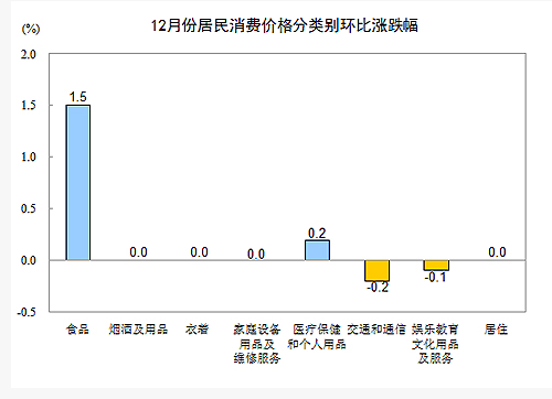 12月份,全國居民消費價格總水平環(huán)比上漲0.5%。其中,城市上漲0.5%,農村上漲0.5%;食品價格上漲1.5%,非食品價格持平;消費品價格上漲0.7%,服務價格持平。