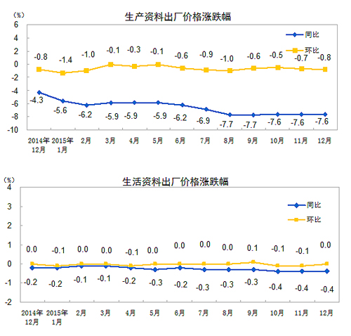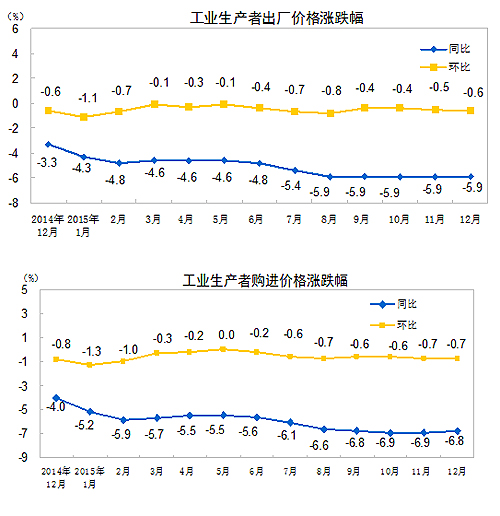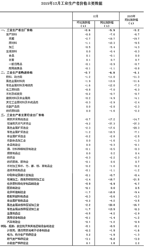2015年12月份,全國工業(yè)生產(chǎn)者出廠價(jià)格環(huán)比下降0.6%,同比下降5.9%。工業(yè)生產(chǎn)者購進(jìn)價(jià)格環(huán)比下降0.7%,同比下降6.8%。2015年,工業(yè)生產(chǎn)者出廠價(jià)格同比下降5.2%,工業(yè)生產(chǎn)者購進(jìn)價(jià)格同比下降6.1%。