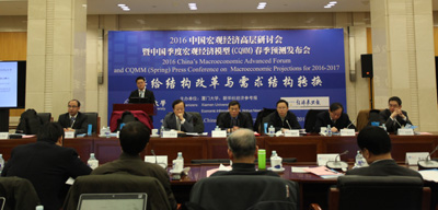 2月25日,廈門(mén)大學(xué)與新華社經(jīng)濟(jì)參考報(bào)社在京聯(lián)合舉行“中國(guó)宏觀經(jīng)濟(jì)高層研討會(huì)暨中國(guó)季度宏觀經(jīng)濟(jì)模型(CQMM)2016春季預(yù)測(cè)發(fā)布會(huì)”。? 本報(bào)記者 王皓然/攝?
